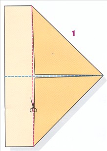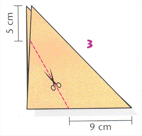 Luk papiret sammen med folderne indad og klip det nederste hjørne af - følg målene på tegningen.